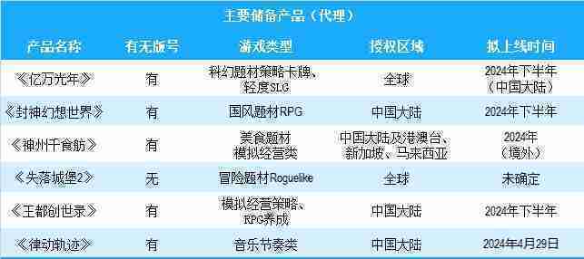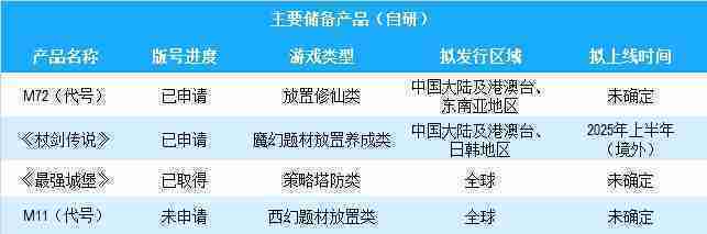 公司有多款储备产品,,,,涵盖放置类、、、、策略类、、RPG、、、Roguelike等多元化游戏品类,,储备的主要自研和代理产品如下:::